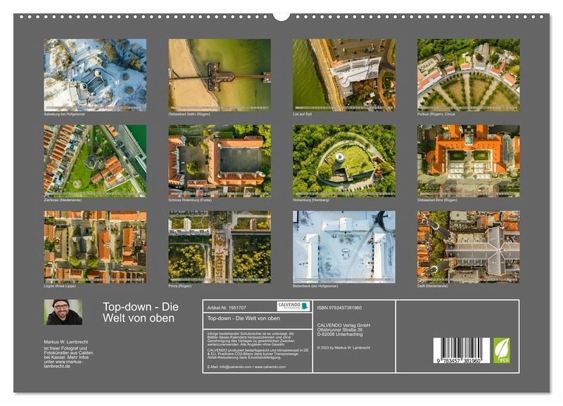 Top-down: So nennen Luftbildfotografen Aufnahmen, die senkrecht nach unten gemacht werden. Bekannte und alltägliche Motive wirken aus dieser Perspektive völlig neu und spektakulär. Unser Kalender lädt Sie ein, unsere Welt einmal mit ganz neuen Augen zu sehen. Lasse Sie sich begeistern von diesen einmaligen Luftbildern!