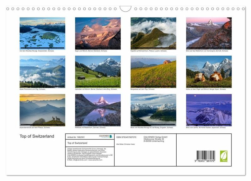 QUALITÄT - Hochwertiger Fotokalender mit 12 wunderschönen Motiven auf lichtbeständigem Bilderdruckpapier, robuste Spiralbindung mit Aufhängebügel.NACHHALTIG - deutliche Abfallreduzierung durch bedarfsgerechte Einzelstückfertigung, umweltfreundliches FSC-zertifiziertes Papier, Produktion in Deutschland, klimabewusste Logistik.PERFEKTES GESCHENK - Kalender für Freunde und Familie, für Kinder und Erwachsene, jung und alt, zu Weihnachten, Geburtstag oder zwischendurch.VIELFALT - Bildkalender in verschiedenen Formaten, z.B. DIN A5, DIN A4, DIN A3 sowie DIN A2. Ob Naturmotiv, Gemälde oder Fotos, ideal für ein persönliches Wohlfühlambiente.Die schönsten Blickpunkte von Schweizer Bergen. von Autor(in): Christian Heeb