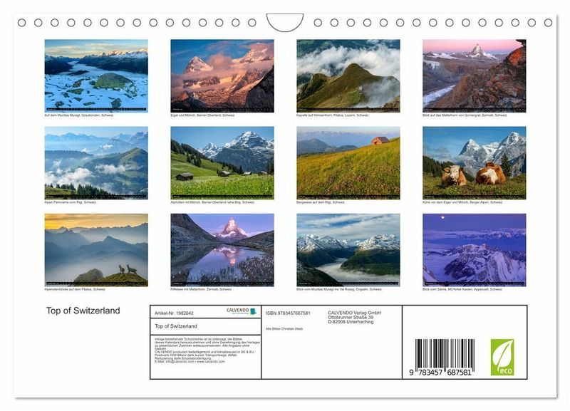 QUALITÄT - Hochwertiger Fotokalender mit 12 wunderschönen Motiven auf lichtbeständigem Bilderdruckpapier, robuste Spiralbindung mit Aufhängebügel.NACHHALTIG - deutliche Abfallreduzierung durch bedarfsgerechte Einzelstückfertigung, umweltfreundliches FSC-zertifiziertes Papier, Produktion in Deutschland, klimabewusste Logistik.PERFEKTES GESCHENK - Kalender für Freunde und Familie, für Kinder und Erwachsene, jung und alt, zu Weihnachten, Geburtstag oder zwischendurch.VIELFALT - Bildkalender in verschiedenen Formaten, z.B. DIN A5, DIN A4, DIN A3 sowie DIN A2. Ob Naturmotiv, Gemälde oder Fotos, ideal für ein persönliches Wohlfühlambiente.Die schönsten Blickpunkte von Schweizer Bergen. von Autor(in): Christian Heeb