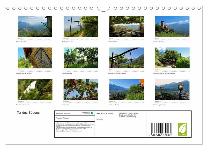 Nicht nur Italienliebhaber werden bei diesen Landschaftsaufnahmen aus der Gegend um Meran ins Träumen geraten. Südtirol bietet wunderbare Sehnsuchtsplätze, die unserer Seele eine Pause vom Alltag bescheren. Holen Sie sich mit diesem Kalender den herrlichen Sommer eines der schönsten Mittelmeerländer nach Hause.