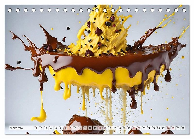 Tortenstücke und Schokokugeln schwirren durch die Luft. Dessertsoßen ergießen sich satt über das mit Sahnehäufchen und buntem Konfekt dekorierte Backwerk. Beim Anblick der leckeren Naschereien läuft wohl jedem Schleckermaul das Wasser im Munde zusammen. Der außergewöhnliche Torten-Kalender von Renate Utz ist das passende Geschenk für alle Leckermäuler und macht auch garantiert nicht dick!