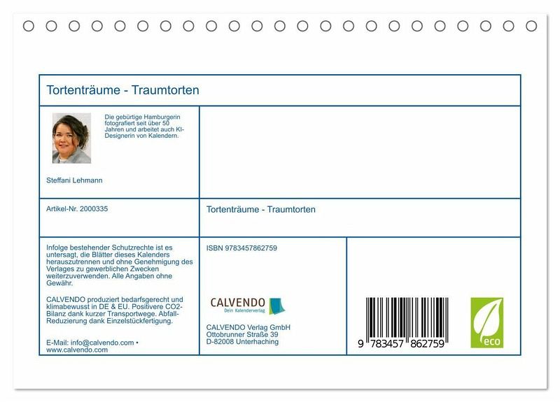 QUALITÄT - Hochwertiger Fotokalender mit 12 wunderschönen Motiven auf lichtbeständigem Bilderdruckpapier, robuste Spiralbindung.NACHHALTIG - deutliche Abfallreduzierung durch bedarfsgerechte Einzelstückfertigung, umweltfreundliches FSC-zertifiziertes Papier, Produktion in Deutschland, klimabewusste Logistik.PERFEKTES GESCHENK - Kalender für Freunde und Familie, für Kinder und Erwachsene, jung und alt, zu Weihnachten, Geburtstag oder zwischendurch.VIELFALT - Bildkalender in verschiedenen Formaten, z.B. DIN A5, DIN A4, DIN A3 sowie DIN A2. Ob Naturmotiv, Gemälde oder Fotos, ideal für ein persönliches Wohlfühlambiente.Genuss pur: 12 geschmackvolle Impressionen von Torten in allenVariationen von Autor(in): Steffani Lehmann