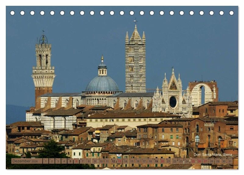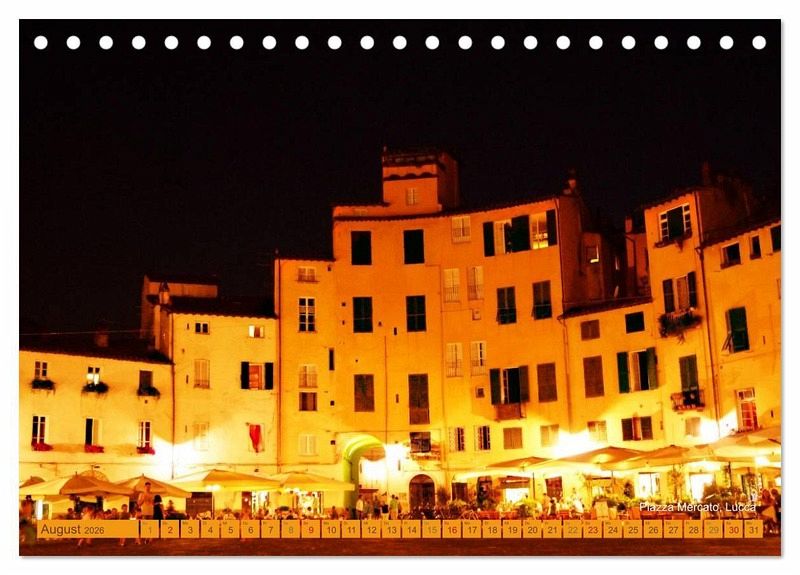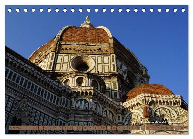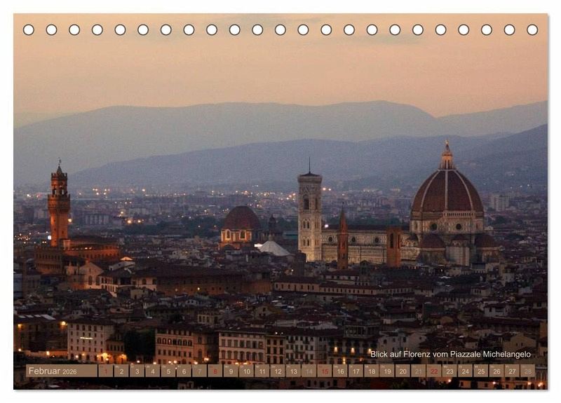 Der attraktive Fotokalender zeigt Städte wie Florenz, Siena oder Lucca mit ihren markanten Bauten. Aber auch Landschaftsaufnahmen wie z.B. von den typischen Zypressenhügeln kommen nicht zu kurz.