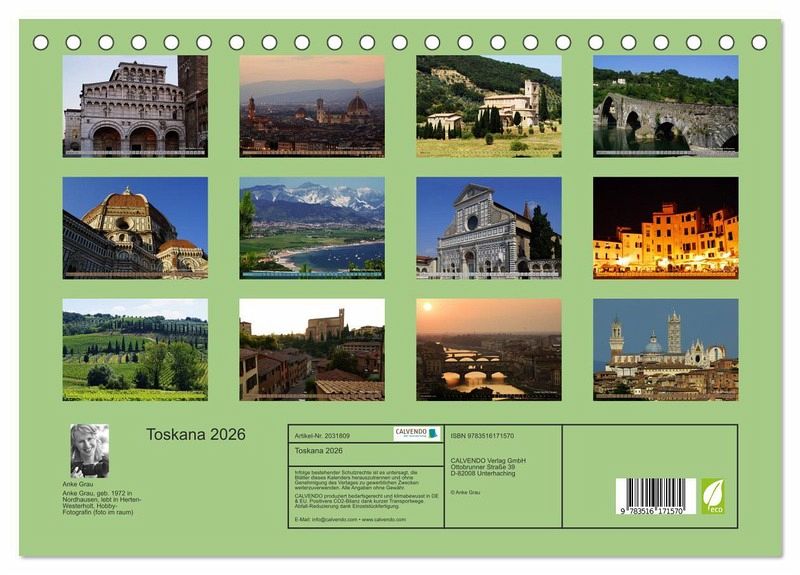 QUALITÄT - Hochwertiger Fotokalender mit 12 wunderschönen Motiven auf lichtbeständigem Bilderdruckpapier, robuste Spiralbindung.NACHHALTIG - deutliche Abfallreduzierung durch bedarfsgerechte Einzelstückfertigung, umweltfreundliches FSC-zertifiziertes Papier, Produktion in Deutschland, klimabewusste Logistik.PERFEKTES GESCHENK - Kalender für Freunde und Familie, für Kinder und Erwachsene, jung und alt, zu Weihnachten, Geburtstag oder zwischendurch.VIELFALT - Bildkalender in verschiedenen Formaten, z.B. DIN A5, DIN A4, DIN A3 sowie DIN A2. Ob Naturmotiv, Gemälde oder Fotos, ideal für ein persönliches Wohlfühlambiente.Traumhafte Fotos von der vielseitigen Toskana von Autor(in): Anke Grau