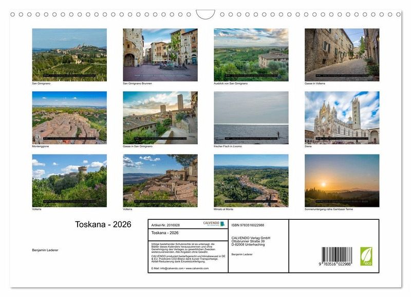 QUALITÄT - Hochwertiger Fotokalender mit 12 wunderschönen Motiven auf lichtbeständigem Bilderdruckpapier, robuste Spiralbindung mit Aufhängebügel.NACHHALTIG - deutliche Abfallreduzierung durch bedarfsgerechte Einzelstückfertigung, umweltfreundliches FSC-zertifiziertes Papier, Produktion in Deutschland, klimabewusste Logistik.PERFEKTES GESCHENK - Kalender für Freunde und Familie, für Kinder und Erwachsene, jung und alt, zu Weihnachten, Geburtstag oder zwischendurch.VIELFALT - Bildkalender in verschiedenen Formaten, z.B. DIN A5, DIN A4, DIN A3 sowie DIN A2. Ob Naturmotiv, Gemälde oder Fotos, ideal für ein persönliches Wohlfühlambiente.Toskana einfach genießen von Autor(in): Benjamin Lederer