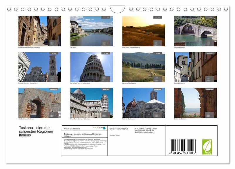 Der vorliegende Kalender hebt die typische Landschaft, sowie historische und kunstgeschichtliche Städte hervor.
