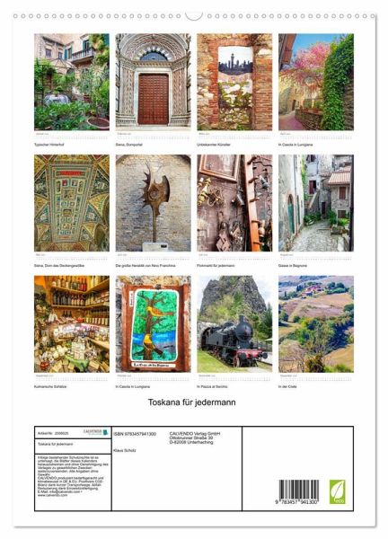 PREMIUM-LINIE - Brillanter Fotokalender mit 12 wunderschönen Motiven, Kunstdruck in Hochglanz in Museumsqualität.QUALITÄT - edle Materialien, stabile Rückwand mit 2 innovativen Einstecktaschen für eine optimale Präsentation an der Wand.NACHHALTIG - deutliche Abfallreduzierung durch bedarfsgerechte Einzelstückfertigung, umweltfreundliches FSC-zertifiziertes Papier, Produktion in Deutschland, klimabewusste Logistik.PERFEKTES GESCHENK - Kalender für Freunde und Familie, für Kinder und Erwachsene, jung und alt, zu Weihnachten, Geburtstag oder zwischendurch.Die Toskana vereint Natur, Kultur, Geschichte und Kulinarik auf eine einzigartige Weise und bietet für jeden Geschmack etwas Besonderes. von Autor(in): Klaus Scholz