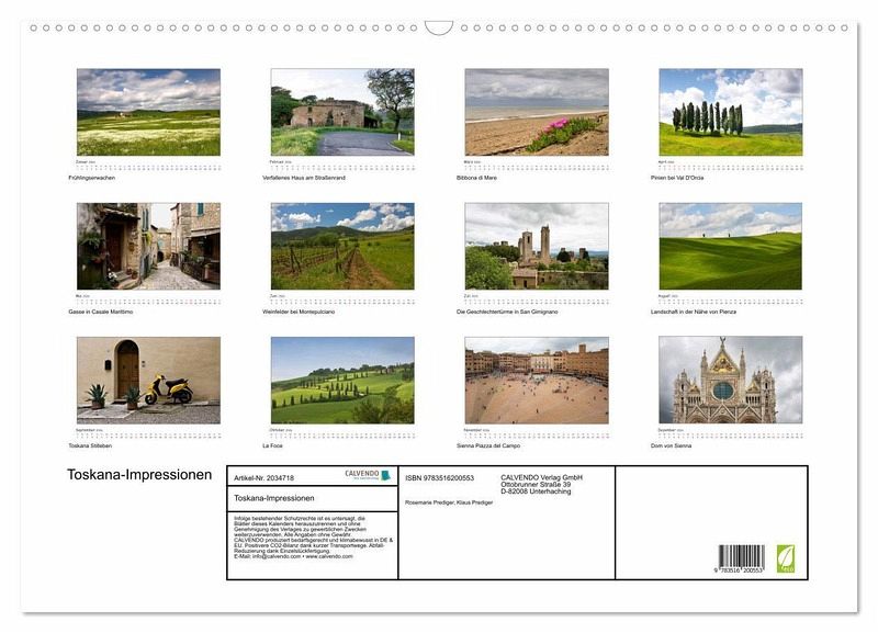 QUALITÄT - Hochwertiger Fotokalender mit 12 wunderschönen Motiven auf lichtbeständigem Bilderdruckpapier, robuste Spiralbindung mit Aufhängebügel.NACHHALTIG - deutliche Abfallreduzierung durch bedarfsgerechte Einzelstückfertigung, umweltfreundliches FSC-zertifiziertes Papier, Produktion in Deutschland, klimabewusste Logistik.PERFEKTES GESCHENK - Kalender für Freunde und Familie, für Kinder und Erwachsene, jung und alt, zu Weihnachten, Geburtstag oder zwischendurch.VIELFALT - Bildkalender in verschiedenen Formaten, z.B. DIN A5, DIN A4, DIN A3 sowie DIN A2. Ob Naturmotiv, Gemälde oder Fotos, ideal für ein persönliches Wohlfühlambiente.Flache Ebenen und sanfte Hügel prägen das Bild der Toskana. von Autor(in): Rosemarie Prediger