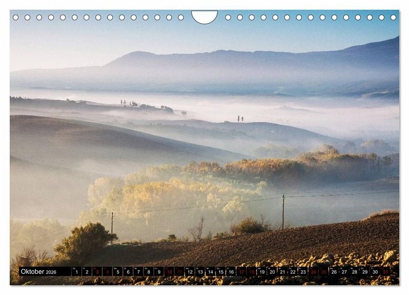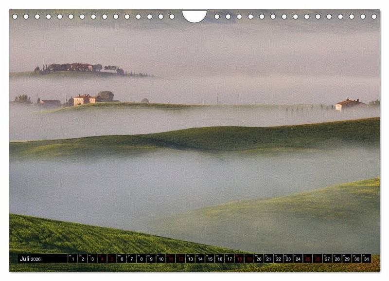 Die Toskana ist bekannt für ihre sanft geschwungenen Hügel und ihr besonderes Licht. Am frühen Morgen, bedeckt der Nebel die Täler - nach und nach gibt er die Details frei und bringt damit die Reize dieser faszinierenden Landschaft in großartiger Weise zum Vorschein. Die Fotos dieses Kalenders entstanden bei mehreren Toskanareisen im Val d'Orcia sowie im Chianti.