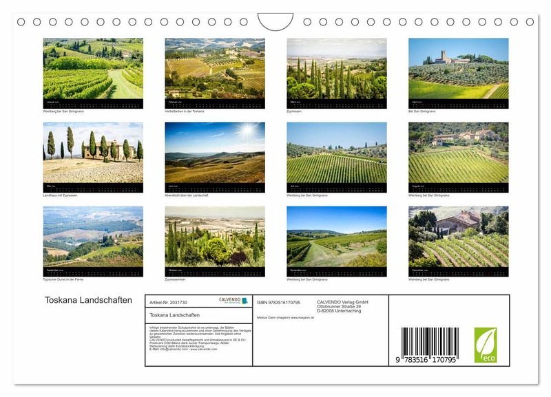 QUALITÄT - Hochwertiger Fotokalender mit 12 wunderschönen Motiven auf lichtbeständigem Bilderdruckpapier, robuste Spiralbindung mit Aufhängebügel.NACHHALTIG - deutliche Abfallreduzierung durch bedarfsgerechte Einzelstückfertigung, umweltfreundliches FSC-zertifiziertes Papier, Produktion in Deutschland, klimabewusste Logistik.PERFEKTES GESCHENK - Kalender für Freunde und Familie, für Kinder und Erwachsene, jung und alt, zu Weihnachten, Geburtstag oder zwischendurch.VIELFALT - Bildkalender in verschiedenen Formaten, z.B. DIN A5, DIN A4, DIN A3 sowie DIN A2. Ob Naturmotiv, Gemälde oder Fotos, ideal für ein persönliches Wohlfühlambiente.Zauberhafte Toskana Landschaften von Autor(in): magann