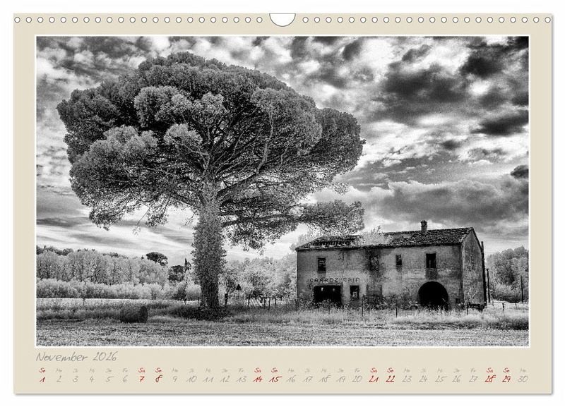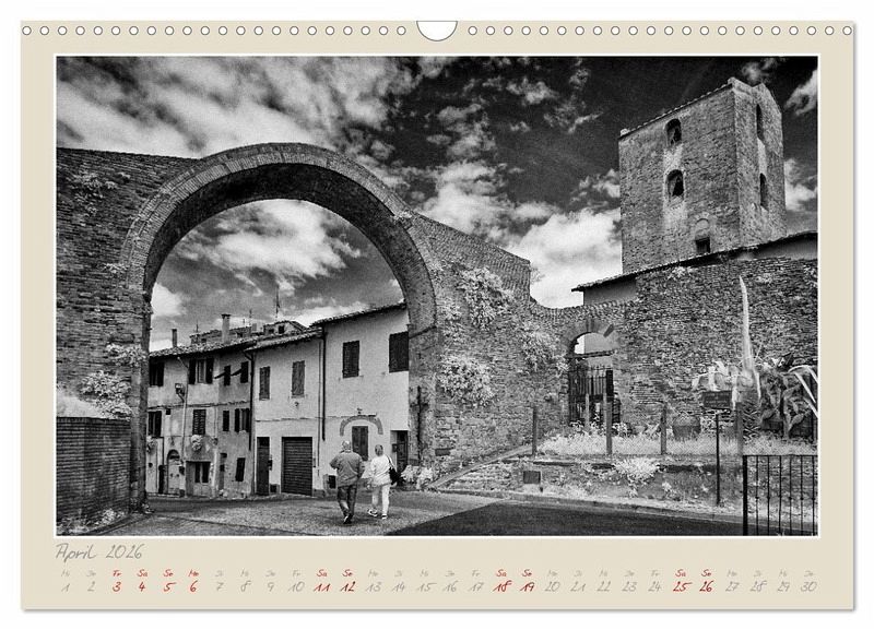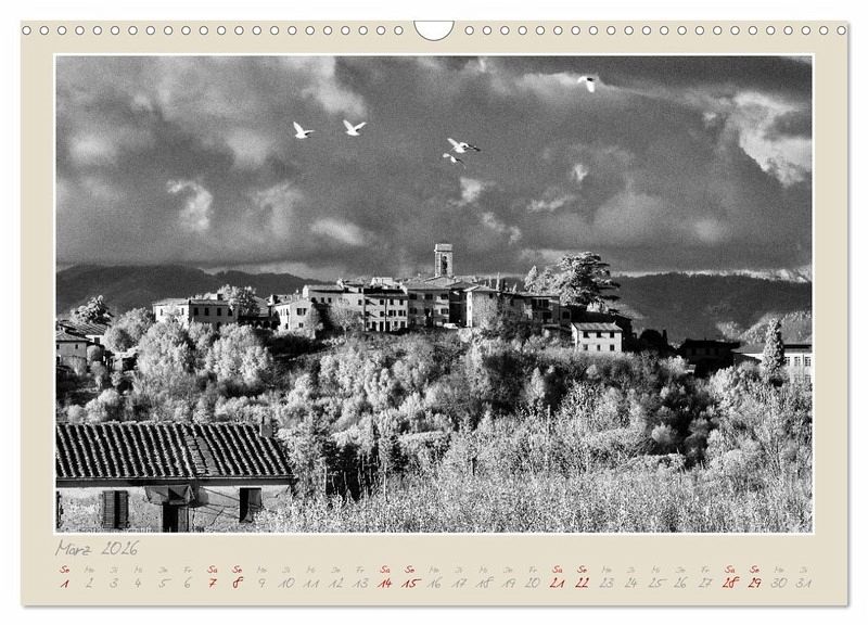 Die Toskana, meine Heimatregion, mit ihren geschichtsträchtigen mittelalterlichen Dörfern, ist seit jeher immer die Quelle der Inspiration für Dichter, Maler und Fotografen gewesen. In den Infrarot Schwarz-Weiß Bildern dieses Kalenders, spürt man eine märchenhafte Stimmung und Gefühle, die den Charme dieser Region unterstreichen.