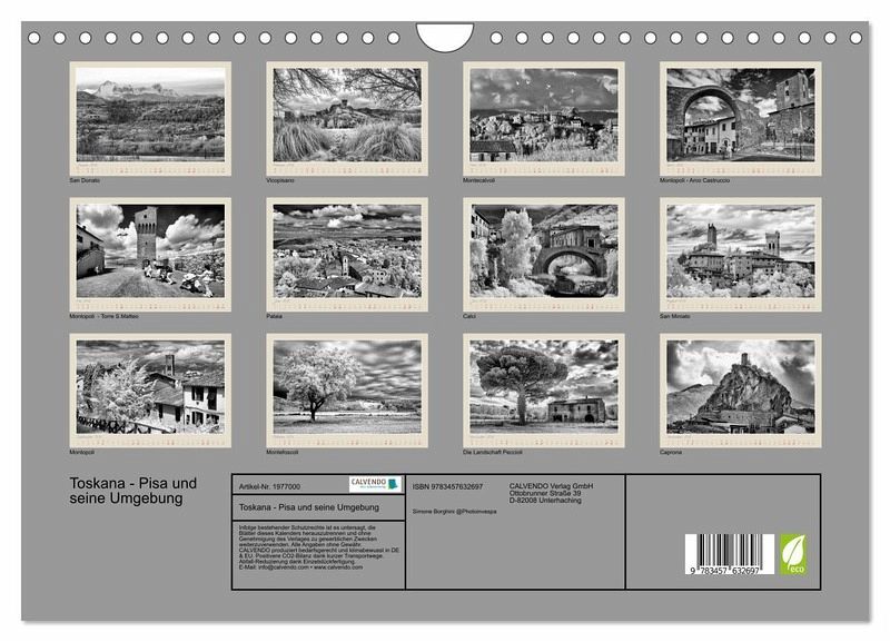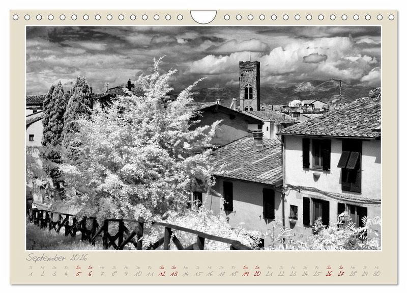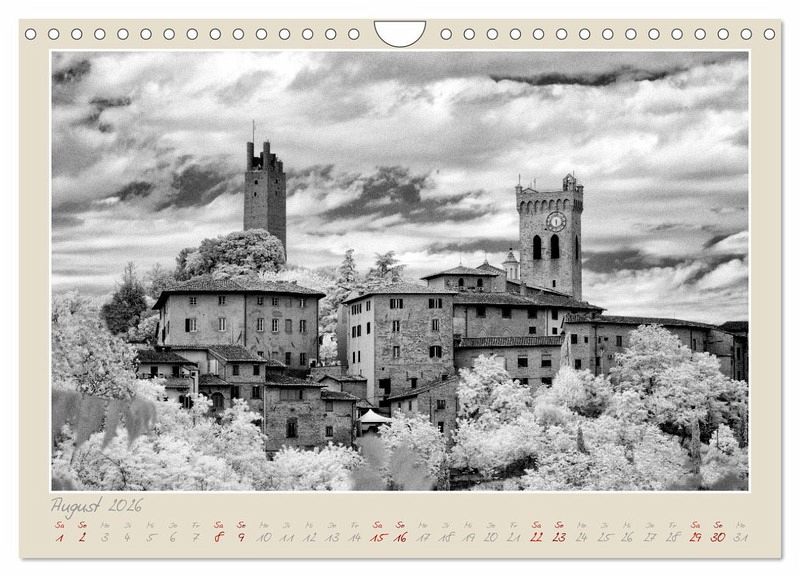 Die Toskana, meine Heimatregion, mit ihren geschichtsträchtigen mittelalterlichen Dörfern, ist seit jeher immer die Quelle der Inspiration für Dichter, Maler und Fotografen gewesen. In den Infrarot Schwarz-Weiß Bildern dieses Kalenders, spürt man eine märchenhafte Stimmung und Gefühle, die den Charme dieser Region unterstreichen.