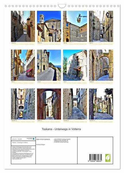 QUALITÄT - Hochwertiger Fotokalender mit 12 wunderschönen Motiven auf lichtbeständigem Bilderdruckpapier, robuste Spiralbindung mit Aufhängebügel.NACHHALTIG - deutliche Abfallreduzierung durch bedarfsgerechte Einzelstückfertigung, umweltfreundliches FSC-zertifiziertes Papier, Produktion in Deutschland, klimabewusste Logistik.PERFEKTES GESCHENK - Kalender für Freunde und Familie, für Kinder und Erwachsene, jung und alt, zu Weihnachten, Geburtstag oder zwischendurch.VIELFALT - Bildkalender in verschiedenen Formaten, z.B. DIN A5, DIN A4, DIN A3 sowie DIN A2. Ob Naturmotiv, Gemälde oder Fotos, ideal für ein persönliches Wohlfühlambiente.Historische Orte der Toskana mit ihren schönen Gassen von Autor(in): Andreas Berger
