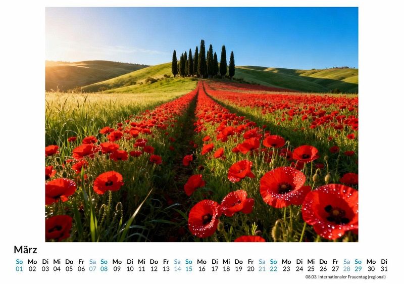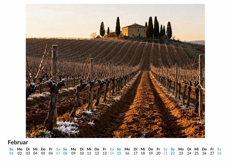 Sanfte Hügel, getaucht in goldenes Licht, durchzogen von schlanken Zypressenalleen und alten Weinreben. Der Kalender "Toskanische Hügellandschaften" fängt diese besondere Stimmung ein und begleitet durch das Jahr. Er ist eine Einladung, die charakteristische Schönheit dieser italienischen Region Monat für Monat zu erleben. Dieser Kalender ist eine passende Wahl: * Für Liebhaber der italienischen Lebensart und der toskanischen Landschaft. * Für Menschen, die eine ruhige und ästhetische Wandgestaltung für ihr Zuhause oder Büro suchen. * Für alle, die sich an harmonischen Landschaftskompositionen erfreuen. Jedes Monatsblatt präsentiert eine Szene, die das Herz der Toskana widerspiegelt. Steinerne Gehöfte schmiegen sich an die Hänge, Weinberge breiten sich unter der Sonne aus und Zypressen zeichnen markante Silhouetten gegen den Himmel. Die Motive entstanden durch die Synthese unzähliger Eindrücke und wurden von einem Algorithmus zu neuen, idealisierten Kompositionen zusammengefügt. So entsteht eine Sammlung von Ansichten, die vertraut wirken und doch eine eigene, ruhige Atmosphäre schaffen. Was der Kalender bietet: * Zwölf sorgfältig ausgewählte Monatsmotive. * Ein praktisches Kalendarium für die Organisation des Alltags. * Eine visuelle Reise durch die Jahreszeiten der Toskana. Dieser Kalender ist eine Hommage an die zeitlose Schönheit der toskanischen Hügellandschaften. Eine Entdeckung der zwölf Monatsansichten lohnt sich, um die volle Wirkung der Kompositionen zu erfahren.