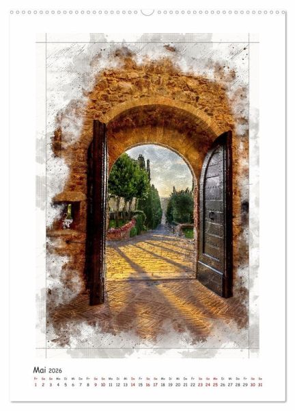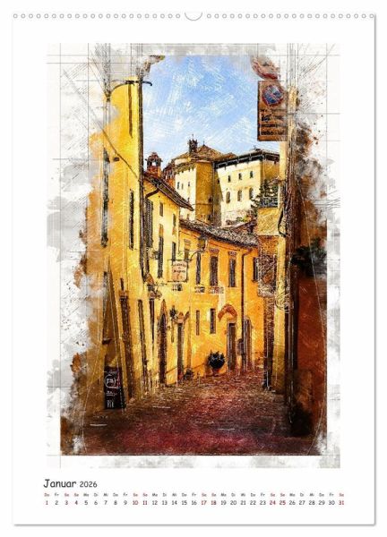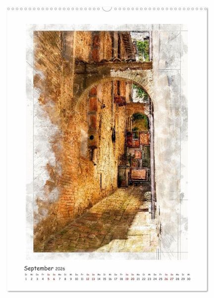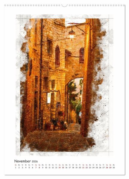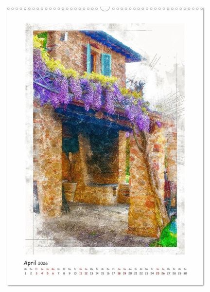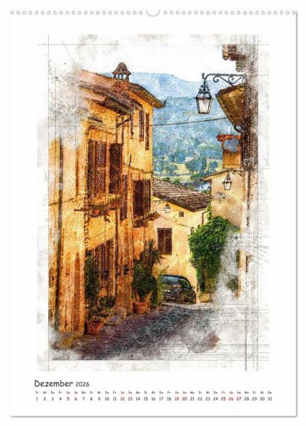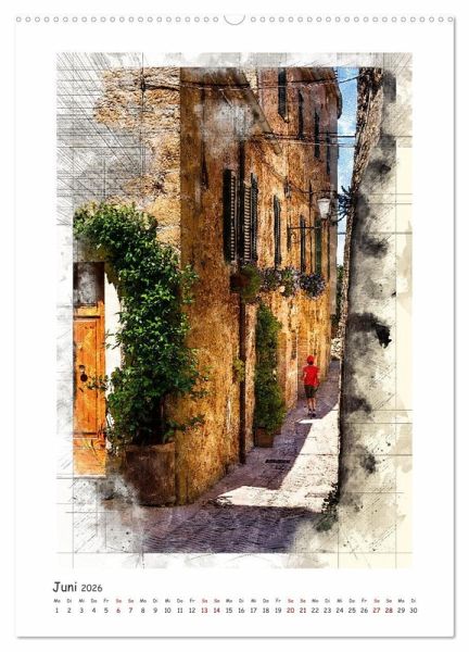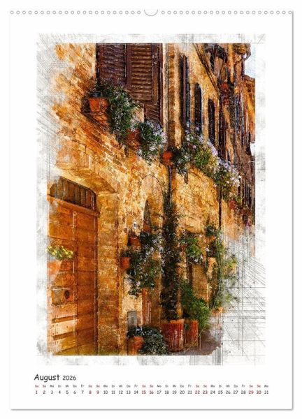 Wer schon einmal im Süden im Urlaub war, kennt die schmalen Gassen der mediterranen Dörfer, die im Sommer durch ihre kühlen Schatten die Hitze erträglich machen. Die Sonne reflektiert von den rauhen Steinmauern und taucht alles in ein wundervolles Licht. Idyllische Winkel laden ein zum Verweilen. Dieser Kalender bringt die weichen, sommerlichen Farben der mittelalterlichen Städte der Toskana in Ihr Haus. Montepulciano, Chiusi, Pienza, Arezzo, Assisi - träumen Sie von Urlaub, Sommer, Sonne, Wein und Entspannung!