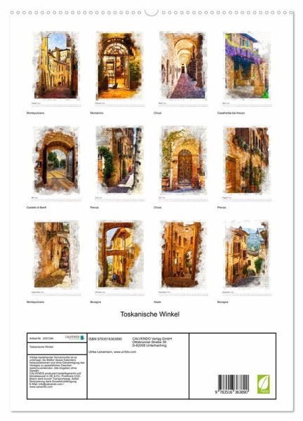 PREMIUM-LINIE - Brillanter Fotokalender mit 12 wunderschönen Motiven, Kunstdruck in Hochglanz in Museumsqualität.QUALITÄT - edle Materialien, stabile Rückwand mit 2 innovativen Einstecktaschen für eine optimale Präsentation an der Wand.NACHHALTIG - deutliche Abfallreduzierung durch bedarfsgerechte Einzelstückfertigung, umweltfreundliches FSC-zertifiziertes Papier, Produktion in Deutschland, klimabewusste Logistik.PERFEKTES GESCHENK - Kalender für Freunde und Familie, für Kinder und Erwachsene, jung und alt, zu Weihnachten, Geburtstag oder zwischendurch.Finden Sie sich wieder in den kühlen Gassen und Winkeln der bezaubernden mittelalterlichen Orte in der Toskana und genießen Sie das Gefühl von Ruhe, Sommer und Sonne. von Autor(in): Ulrike Leinemann
