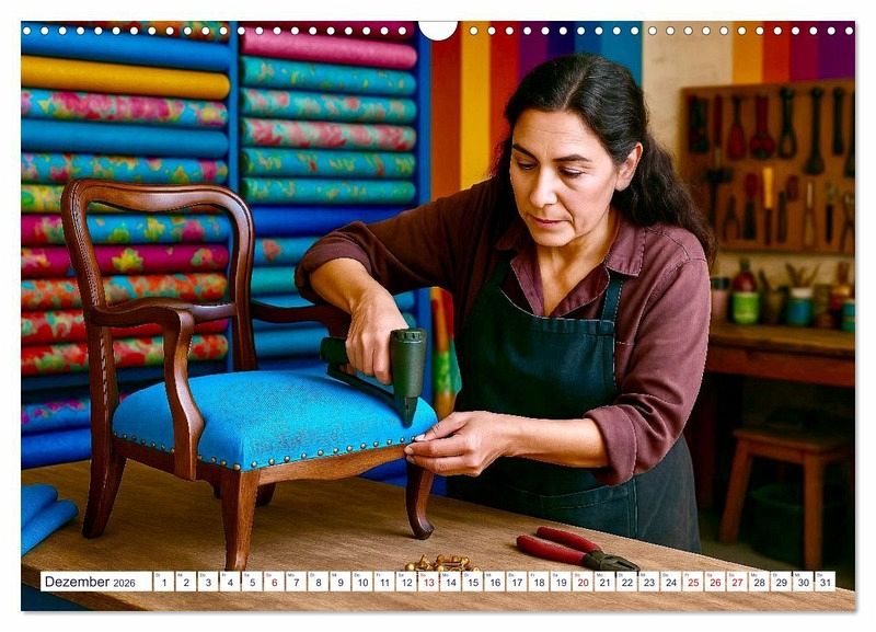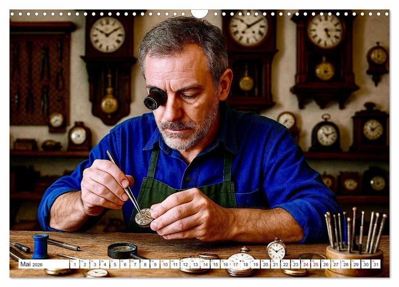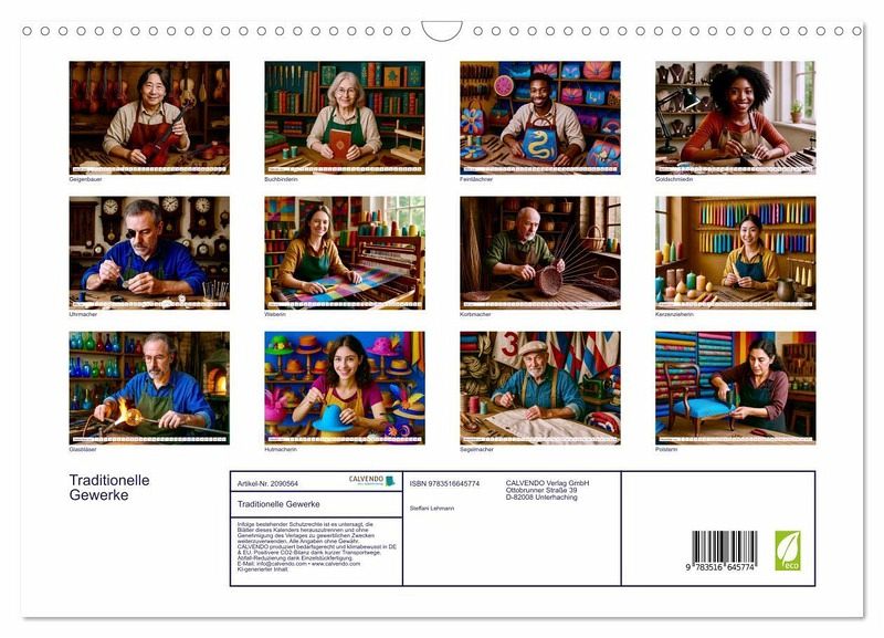 Dieser hochwertige Kalender zeigt zwölf authentische Werkstätten. Von der Buchmacherin bis zum Uhrmacher: Jeder Monat stellt ein traditionelles Handwerk vor. Die Aufnahmen, die Steffani Lehmann mit Unterstützung einer KI editiert hat, geben Einblick in Ateliers, Werkzeuge und Techniken des handwerklichen Alltags.