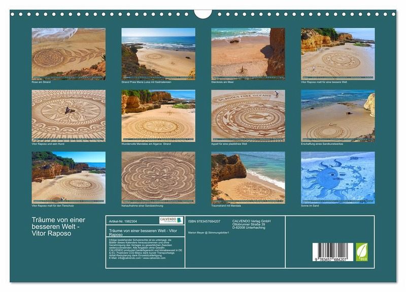 Ein Mann, ein Idealist, jemand, der für seine Träume von einer gesunden Welt einsteht-das ist der Künstler Vitor Raposo. Am Strand zeichnet er seine Kunstwerke in den Sand. So ist er mittlerweile zu einer Berühmtheit an der traumhaften Algarve Küste Portugals geworden. Aber auch Magazine und Fernsehteams begleiten seine Arbeit. Viele Menschen kommen und staunen. Mit diesem Kalender haben auch Sie die Möglichkeit, die einzigartigen Kunstwerke zu genießen und ihre Magie zu erleben. Lassen Sie sich von den leuchtenden Fotografien mitnehmen in eine bessere Welt.