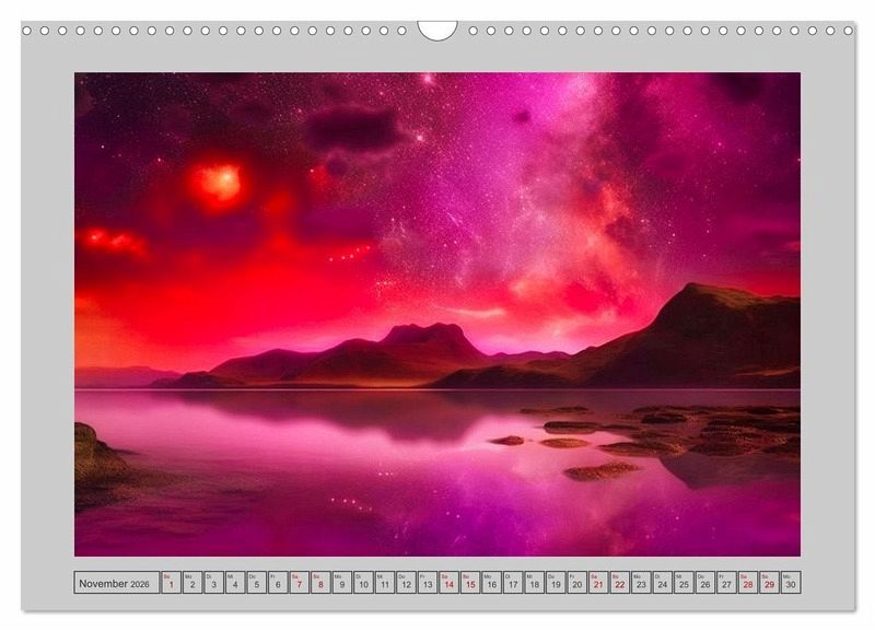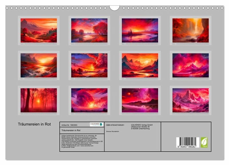 Entdecken Sie die Schönheit der Natur in einem völlig neuen Licht mit unserem atemberaubenden Kalender für das kommende Jahr. Tauchen Sie ein in die faszinierende Welt der Landschaften, die in warmen Rottönen erstrahlen. Jeder Monat präsentiert eine einzigartige Szenerie, die Ihre Sinne verzaubern wird. Dieser Kalender ist nicht nur eine zeitliche Orientierung, sondern auch ein - von künstlicher Intelligenz erstelltes - Kunstwerk, das Sie Monat für Monat aufs Neue begeistern wird.