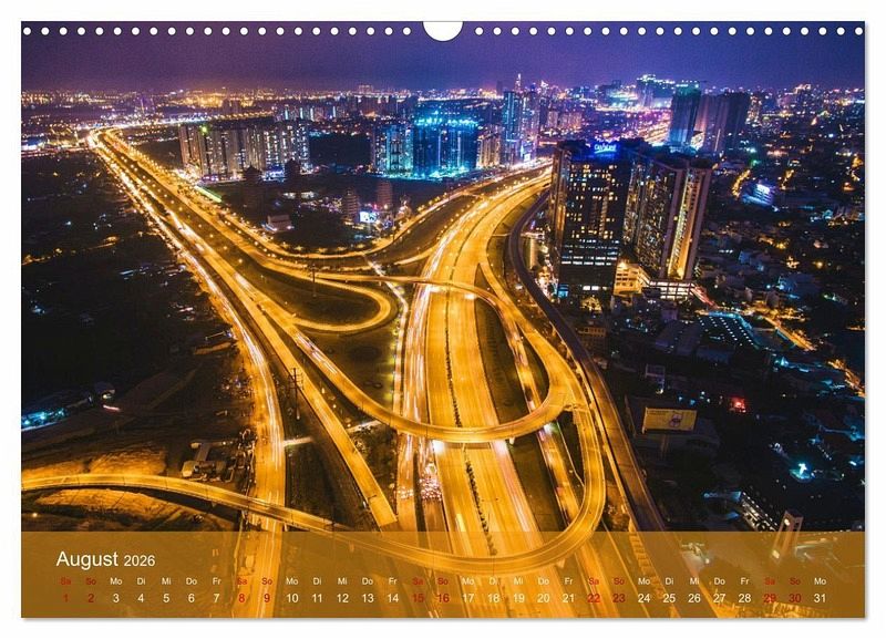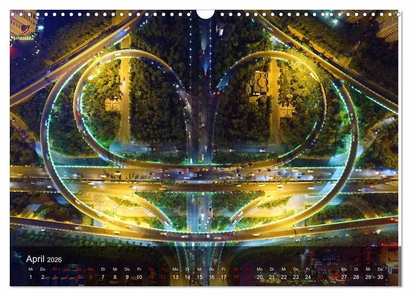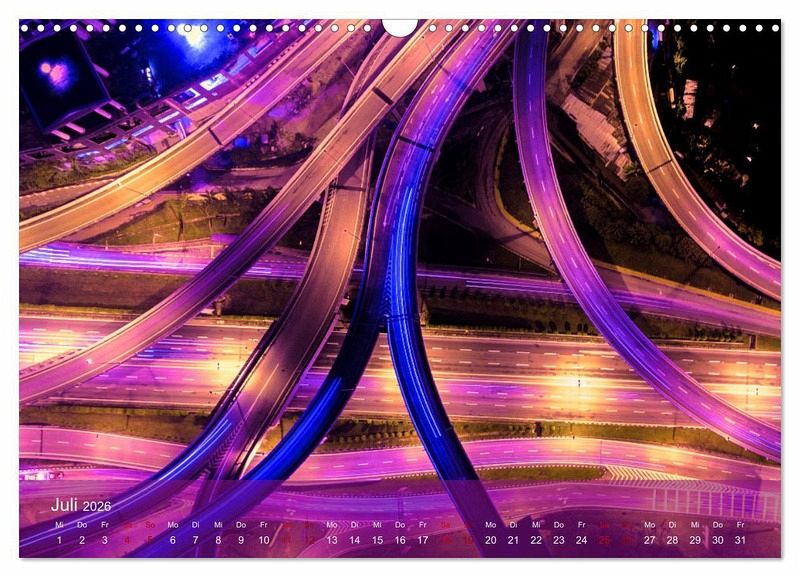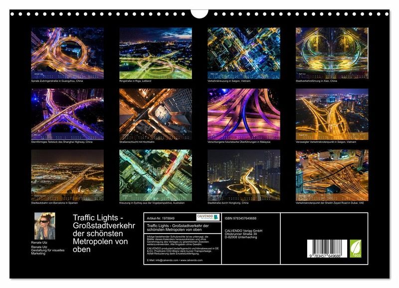 Der außergewöhnliche Kalender von Renate Utz fasziniert mit fantastischen Nachtaufnahmen beeindruckender Verkehrswege aus der Vogelperspektive. Die lichtdurchfluteten Kreuzungen und verworrenen Verkehrsschleifen aufwendiger Trassenführungen zeigen dem Betrachter eine futuristische Ansicht großstädtischer Architektur aus der Luft. Lassen auch sie sich Monat für Monat verzaubern vom surrealen Lichtstreifengewirr des urbanen Verkehrsdschungels verschiedener Megastädte. Das etwas andere Geschenk für alle, die das Ausgefallene und Besondere lieben.