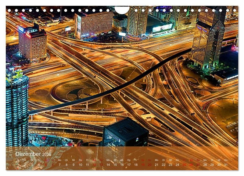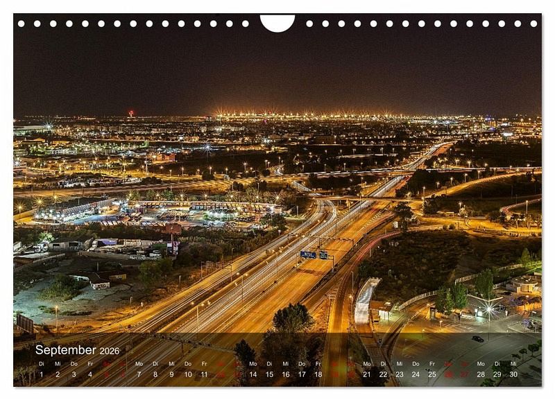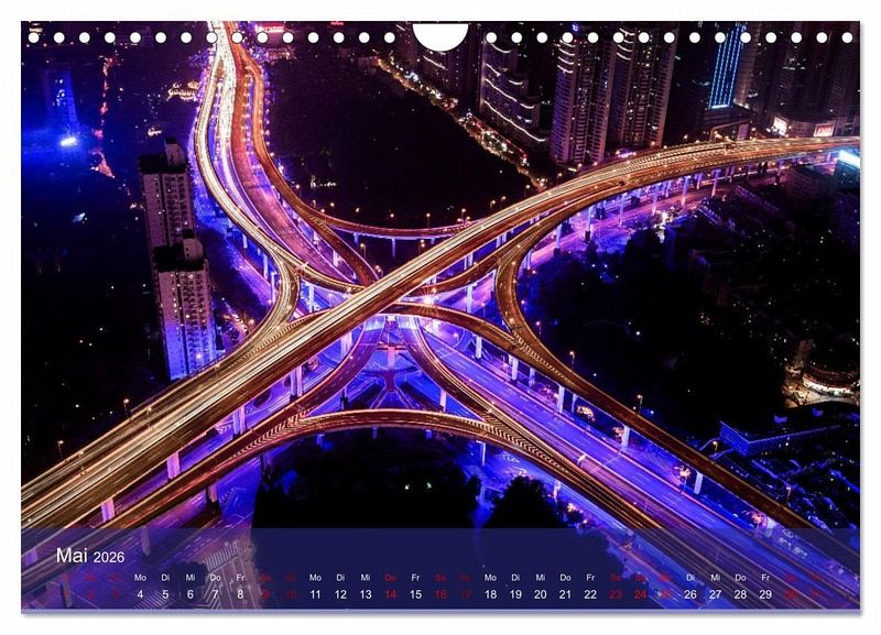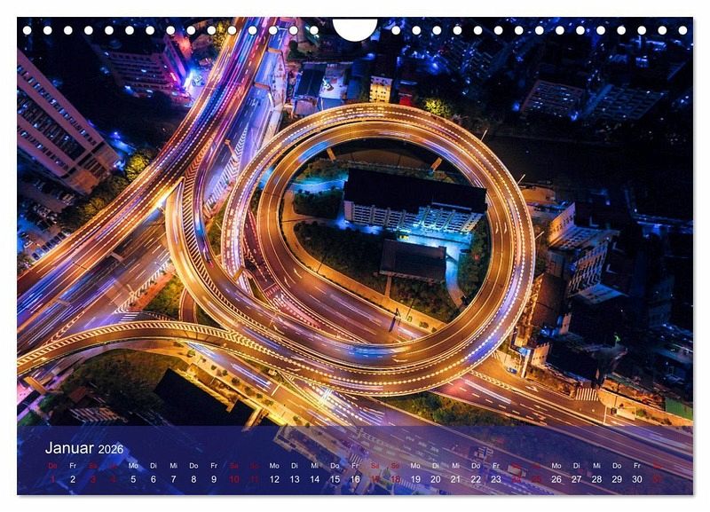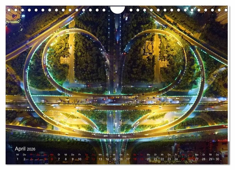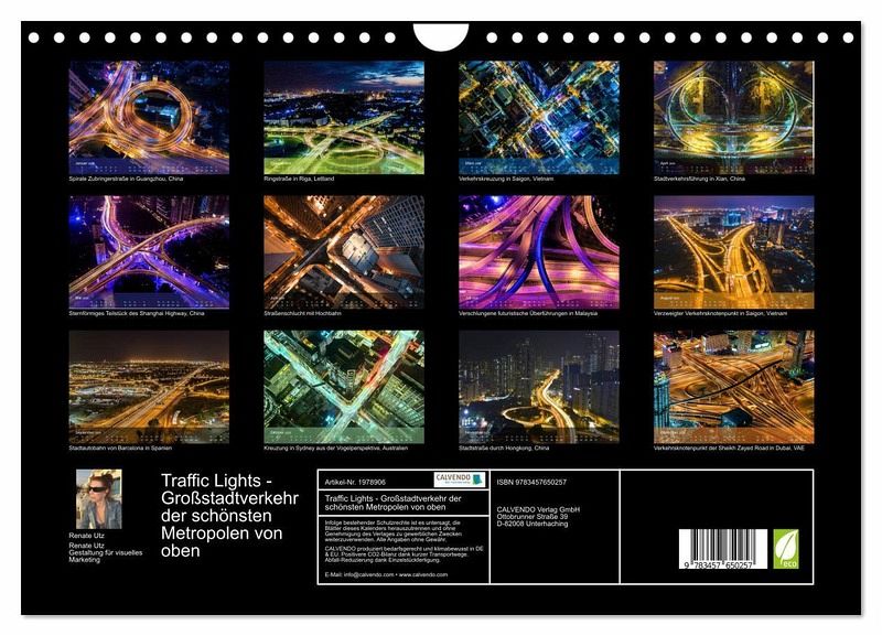 Der außergewöhnliche Kalender von Renate Utz fasziniert mit fantastischen Nachtaufnahmen beeindruckender Verkehrswege aus der Vogelperspektive. Die lichtdurchfluteten Kreuzungen und verworrenen Verkehrsschleifen aufwendiger Trassenführungen zeigen dem Betrachter eine futuristische Ansicht großstädtischer Architektur aus der Luft. Lassen auch sie sich Monat für Monat verzaubern vom surrealen Lichtstreifengewirr des urbanen Verkehrsdschungels verschiedener Megastädte. Das etwas andere Geschenk für alle, die das Ausgefallene und Besondere lieben.
