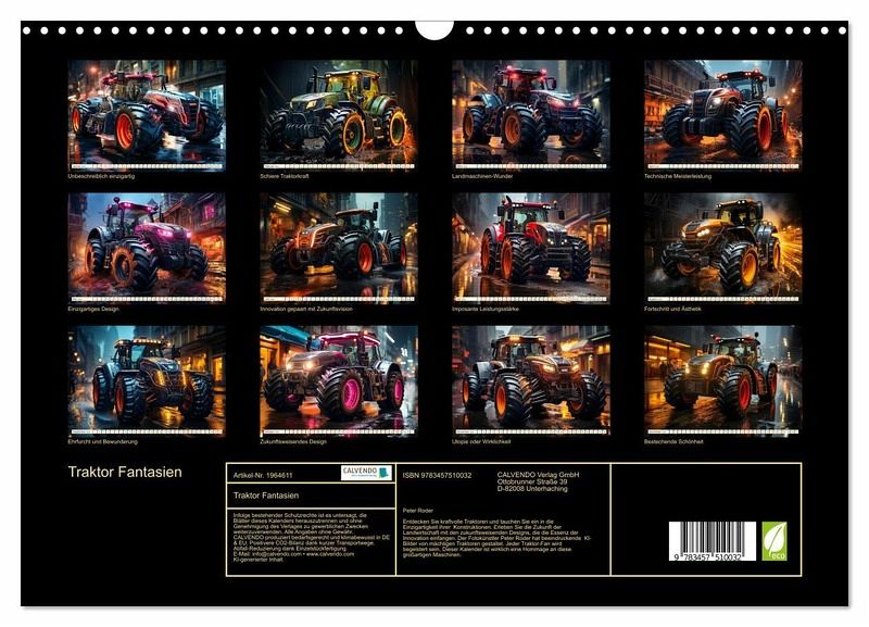Entdecken Sie kraftvolle Traktoren und tauchen Sie ein in die Einzigartigkeit ihrer Konstruktionen. Erleben Sie die Zukunft der Landwirtschaft mit den zukunftsweisenden Designs, die die Essenz der Innovation einfangen. Der Fotokünstler Peter Roder hat beeindruckende KI-Bilder von mächtigen Traktoren gestaltet. Jeder Traktor-Fan wird begeistert sein, Dieser Kalender ist wirklich eine Hommage an diese großartigen Maschinen.
