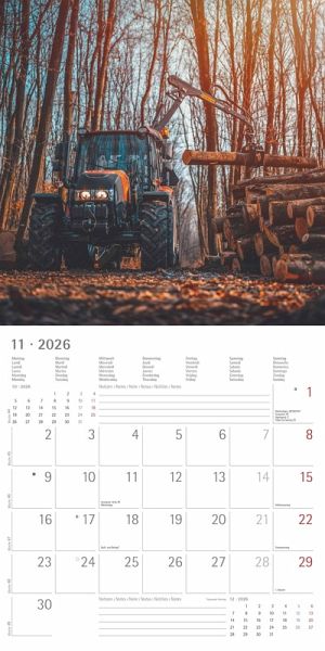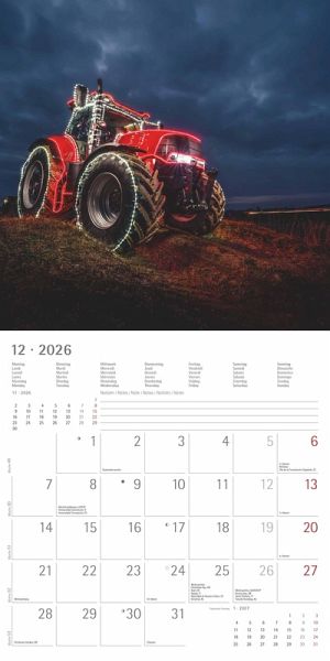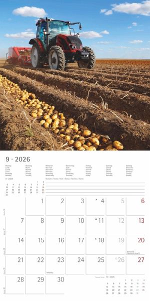 Das übersichtliche Kalendarium, welches Monat für Monat zahlreiche Zusatzinformationen liefert (z. B. Monatsübersichten, Ferientermine oder Mondphasen) und auch viel Platz für Notizen bietet, fügt sich harmonisch unter den Fotomotiven an. Lassen Sie sich vom dem Kalender Traktoren 2026 durch das Jahr begleiten.