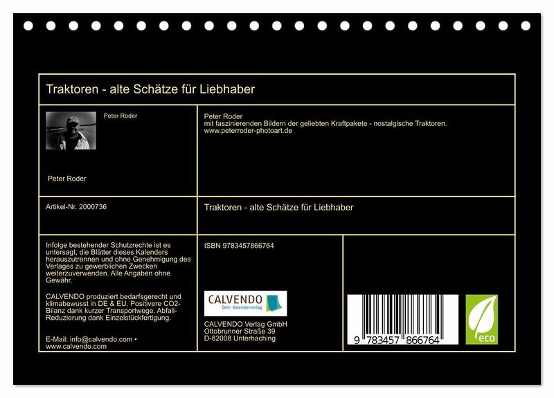 QUALITÄT - Hochwertiger Fotokalender mit 12 wunderschönen Motiven auf lichtbeständigem Bilderdruckpapier, robuste Spiralbindung.NACHHALTIG - deutliche Abfallreduzierung durch bedarfsgerechte Einzelstückfertigung, umweltfreundliches FSC-zertifiziertes Papier, Produktion in Deutschland, klimabewusste Logistik.PERFEKTES GESCHENK - Kalender für Freunde und Familie, für Kinder und Erwachsene, jung und alt, zu Weihnachten, Geburtstag oder zwischendurch.VIELFALT - Bildkalender in verschiedenen Formaten, z.B. DIN A5, DIN A4, DIN A3 sowie DIN A2. Ob Naturmotiv, Gemälde oder Fotos, ideal für ein persönliches Wohlfühlambiente.Nostalgische Traktoren - geliebte Kraftpakete, die viele in ihren Bann ziehen von Autor(in): Peter Roder