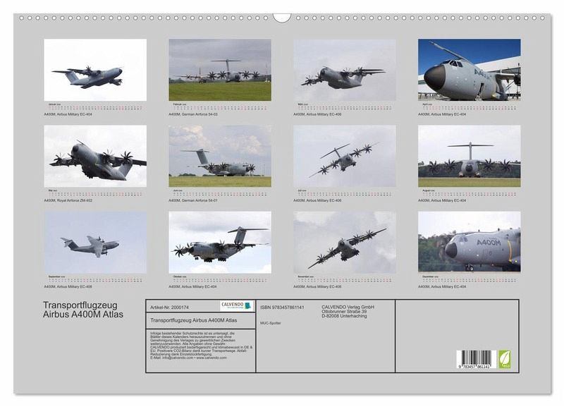 In diesem Kalender finden Sie eine Auswahl von aufregenden und faszinierenden Motiven des Airbus A400M. Erfreuen Sie sich jeden Monat an einem neuen Bild. Die A400M ist ein militärisches Transportflugzeug welches die Transall ersetzen soll. Nutzlast und Reichweite zeichnet die viermotorige Turboprop gegenüber ihrer Vorgänger aus. Sie kann selbst auf unbefestigten Pisten landen. Der Erstflug erfolgte im Dez. 2009 in Sevilla. Die Deutsche Luftwaffe erhielt ihren ersten A400M im Dez 2014. Er besitzt die Fähigkeit Lasten bis zum Umfang eines Schützenpanzers oder eines mittleren Hubschraubers…mehr