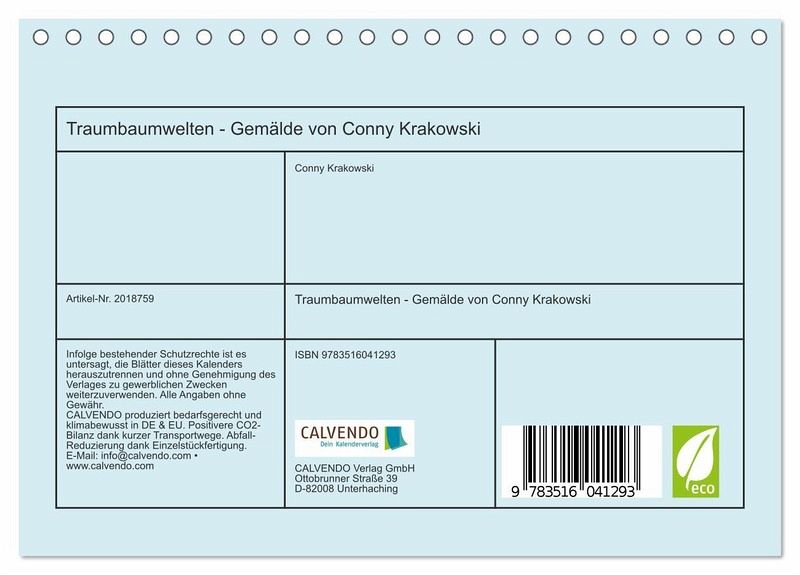 QUALITÄT - Hochwertiger Fotokalender mit 12 wunderschönen Motiven auf lichtbeständigem Bilderdruckpapier, robuste Spiralbindung.NACHHALTIG - deutliche Abfallreduzierung durch bedarfsgerechte Einzelstückfertigung, umweltfreundliches FSC-zertifiziertes Papier, Produktion in Deutschland, klimabewusste Logistik.PERFEKTES GESCHENK - Kalender für Freunde und Familie, für Kinder und Erwachsene, jung und alt, zu Weihnachten, Geburtstag oder zwischendurch.VIELFALT - Bildkalender in verschiedenen Formaten, z.B. DIN A5, DIN A4, DIN A3 sowie DIN A2. Ob Naturmotiv, Gemälde oder Fotos, ideal für ein persönliches Wohlfühlambiente.Kommen Sie mit zu den zauberhaften Traumbaumwelten! von Autor(in): Conny Krakowski