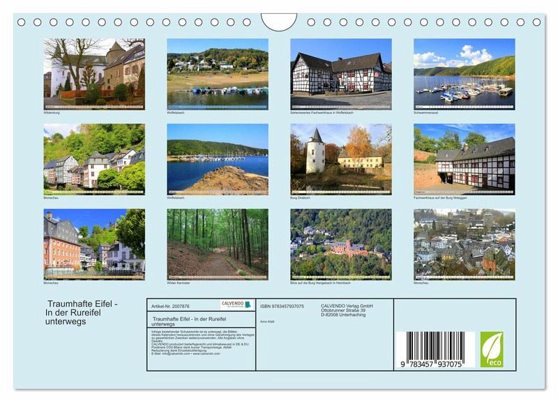 Die Rureifel zählt mit zu den schönsten Regionen der Eifel. Bekannt durch ihre Vielzahl an Sehenswürdigkeiten. Ob herrliche Orte, Burgen, oder Talsperren. Die bekannteste Talsperre ist der Rursee. Schöne und sehenswerte Eindrücke der Rureifel sind im Kalender zu sehen. Im Kalender kommt diese Schönheit der Rureifel bestens zur Wirkung.