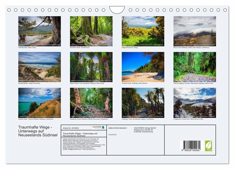 Neuseeland ist bekannt für seine vielfältige Landschaft und für unberührte Natur. Besonders die größere und weitgehend naturbelassene Südinsel zählt für Naturliebhaber und Erholungsuchende zu den beliebtesten Zielen der Erde. Schmale, abwechslungsreiche Wege führen durch die oft einsame Natur. Der Kalender lädt mit wunderschönen Bildern zum träumen von Neuseelands einzigartiger Landschaft ein.