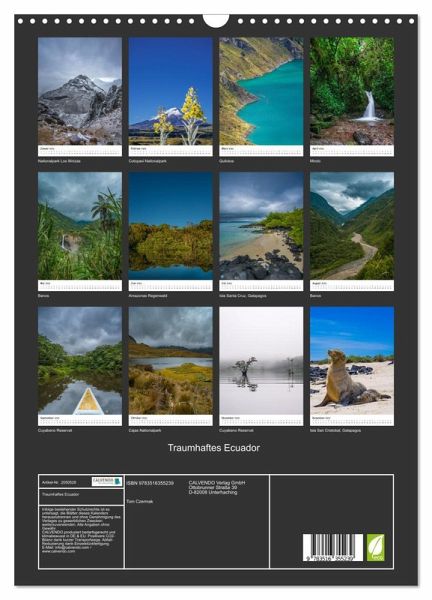 QUALITÄT - Hochwertiger Fotokalender mit 12 wunderschönen Motiven auf lichtbeständigem Bilderdruckpapier, robuste Spiralbindung mit Aufhängebügel.NACHHALTIG - deutliche Abfallreduzierung durch bedarfsgerechte Einzelstückfertigung, umweltfreundliches FSC-zertifiziertes Papier, Produktion in Deutschland, klimabewusste Logistik.PERFEKTES GESCHENK - Kalender für Freunde und Familie, für Kinder und Erwachsene, jung und alt, zu Weihnachten, Geburtstag oder zwischendurch.VIELFALT - Bildkalender in verschiedenen Formaten, z.B. DIN A5, DIN A4, DIN A3 sowie DIN A2. Ob Naturmotiv, Gemälde oder Fotos, ideal für ein persönliches Wohlfühlambiente.Die Landschaft und Tierwelt von Ecuador sind einzigartig. von Autor(in): Tom Czermak