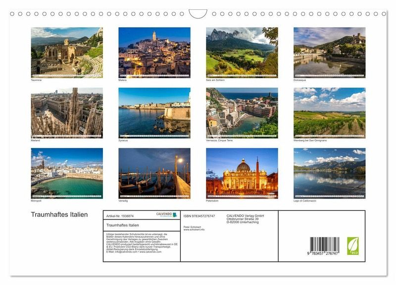 Entdecken Sie mit diesem faszinierenden Kalender vom Reisefotografen Peter Schickert die Schätze dieses zauberhaften Landes! Jeder Monat mit professionellen Aufnahmen der malerischen Landschaften und historischen Städte die Italien so einzigartig machen.