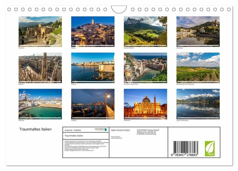 Entdecken Sie mit diesem faszinierenden Kalender vom Reisefotografen Peter Schickert die Schätze dieses zauberhaften Landes! Jeder Monat mit professionellen Aufnahmen der malerischen Landschaften und historischen Städte die Italien so einzigartig machen.