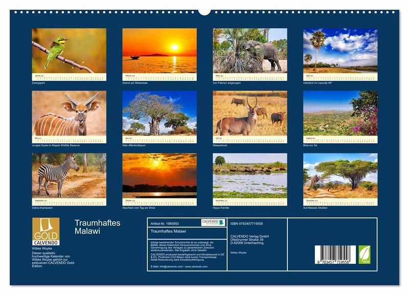Das warme Herz Afrikas - mit diesem Spruch wirbt Malawi für sich. Tatsächlich sind die Menschen überaus herzlich. Und die Natur bietet viel: Vom berühmten Malawisee über den Liwonde Nationalpark bis hin zum Majete Wildlife Reserve - traumhafte Erlebnisse warten auf Besucher, die all das ganz abseits des Massentourismus' erleben können. Dieser qualitativ hochwertige Kalender gehört zur exklusiven CALVENDO Gold-Edition!