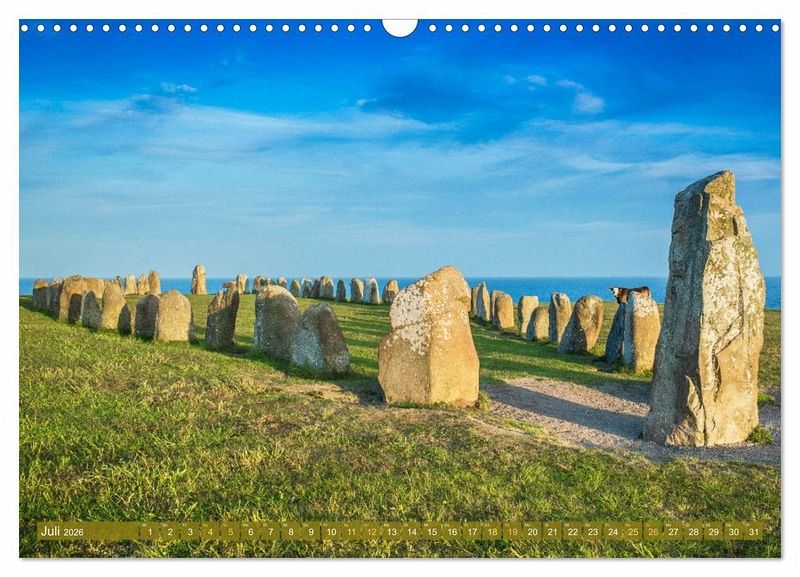 Juli: Schiffssetzung Ales Stenar, aus bogenförmig angeordneten Steinen symbolisiert das Schiff ins Totenreich, Kåseberga, Schonen, Schweden