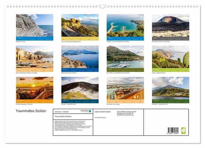 QUALITÄT - Hochwertiger Fotokalender mit 12 wunderschönen Motiven auf lichtbeständigem Bilderdruckpapier, robuste Spiralbindung mit Aufhängebügel.NACHHALTIG - deutliche Abfallreduzierung durch bedarfsgerechte Einzelstückfertigung, umweltfreundliches FSC-zertifiziertes Papier, Produktion in Deutschland, klimabewusste Logistik.PERFEKTES GESCHENK - Kalender für Freunde und Familie, für Kinder und Erwachsene, jung und alt, zu Weihnachten, Geburtstag oder zwischendurch.VIELFALT - Bildkalender in verschiedenen Formaten, z.B. DIN A5, DIN A4, DIN A3 sowie DIN A2. Ob Naturmotiv, Gemälde oder Fotos, ideal für ein persönliches Wohlfühlambiente.Die wunderschönsten Orte von Sizilien von Autor(in): Stina Mydzyn