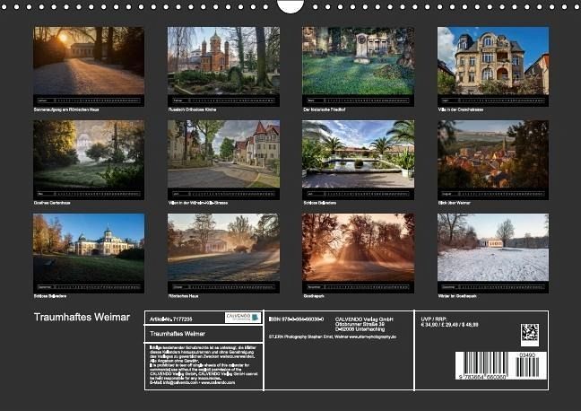 Monatskalender mit Fotos, die Weimar anders zeigen, als in den meisten Publikationen. Die Fotos aus ungewohnten Blickwinkeln begeistern durch traumhaftes Licht, Farb- und Bildkompositionen. Vom Bildautor von "Klassisch Modern Lebensstile in Weimar"