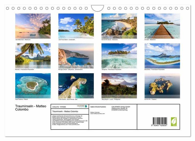 QUALITÄT - Hochwertiger Fotokalender mit 12 wunderschönen Motiven auf lichtbeständigem Bilderdruckpapier, robuste Spiralbindung mit Aufhängebügel.NACHHALTIG - deutliche Abfallreduzierung durch bedarfsgerechte Einzelstückfertigung, umweltfreundliches FSC-zertifiziertes Papier, Produktion in Deutschland, klimabewusste Logistik.PERFEKTES GESCHENK - Kalender für Freunde und Familie, für Kinder und Erwachsene, jung und alt, zu Weihnachten, Geburtstag oder zwischendurch.VIELFALT - Bildkalender in verschiedenen Formaten, z.B. DIN A5, DIN A4, DIN A3 sowie DIN A2. Ob Naturmotiv, Gemälde oder Fotos, ideal für ein persönliches Wohlfühlambiente.Wunderbare Inseln aus aller Welt von Autor(in): Matteo Colombo