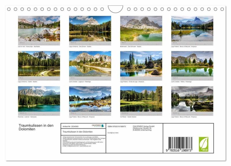 QUALITÄT - Hochwertiger Fotokalender mit 12 wunderschönen Motiven auf lichtbeständigem Bilderdruckpapier, robuste Spiralbindung mit Aufhängebügel.NACHHALTIG - deutliche Abfallreduzierung durch bedarfsgerechte Einzelstückfertigung, umweltfreundliches FSC-zertifiziertes Papier, Produktion in Deutschland, klimabewusste Logistik.PERFEKTES GESCHENK - Kalender für Freunde und Familie, für Kinder und Erwachsene, jung und alt, zu Weihnachten, Geburtstag oder zwischendurch.VIELFALT - Bildkalender in verschiedenen Formaten, z.B. DIN A5, DIN A4, DIN A3 sowie DIN A2. Ob Naturmotiv, Gemälde oder Fotos, ideal für ein persönliches Wohlfühlambiente.Traumhafte Bergseen in den italienischen Dolomiten von Autor(in): uwe vahle