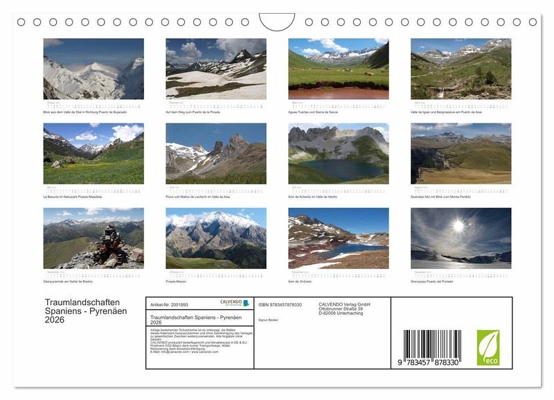 QUALITÄT - Hochwertiger Fotokalender mit 12 wunderschönen Motiven auf lichtbeständigem Bilderdruckpapier, robuste Spiralbindung mit Aufhängebügel.NACHHALTIG - deutliche Abfallreduzierung durch bedarfsgerechte Einzelstückfertigung, umweltfreundliches FSC-zertifiziertes Papier, Produktion in Deutschland, klimabewusste Logistik.PERFEKTES GESCHENK - Kalender für Freunde und Familie, für Kinder undErwachsene, jung und alt, zu Weihnachten, Geburtstag oder zwischendurch.VIELFALT - Bildkalender in verschiedenen Formaten, z.B. DIN A5, DIN A4, DIN A3 sowie DIN A2. Ob Naturmotiv, Gemälde oder Fotos, ideal für ein persönliches Wohlfühlambiente.Die Highlights der Zentralpyrenäen von Autor(in): Sigrun Becker