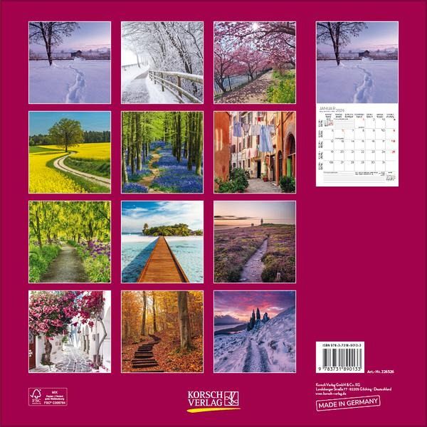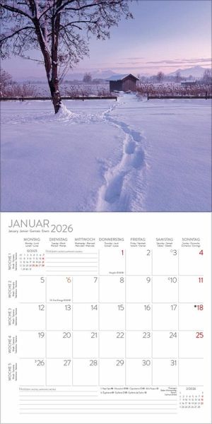 Wandkalender im Format: 30 x 30 cm; Offenes Format: 30 x 60 cm; umweltfreundliches FSC PapierJede Kalenderseite mit großem Bild und viel Platz im Kalendarium für Notizen und TermineMehrsprachiges Kalendarium: DE/GB/FR/IT/ES mit Feiertagen für D/A/CH/GB/FR/IT/ESRegionale Ferienzeiten für DE/A/CHMonatsübersicht für den jeweiligen Vor- und Nachmonat; Jahresübersicht