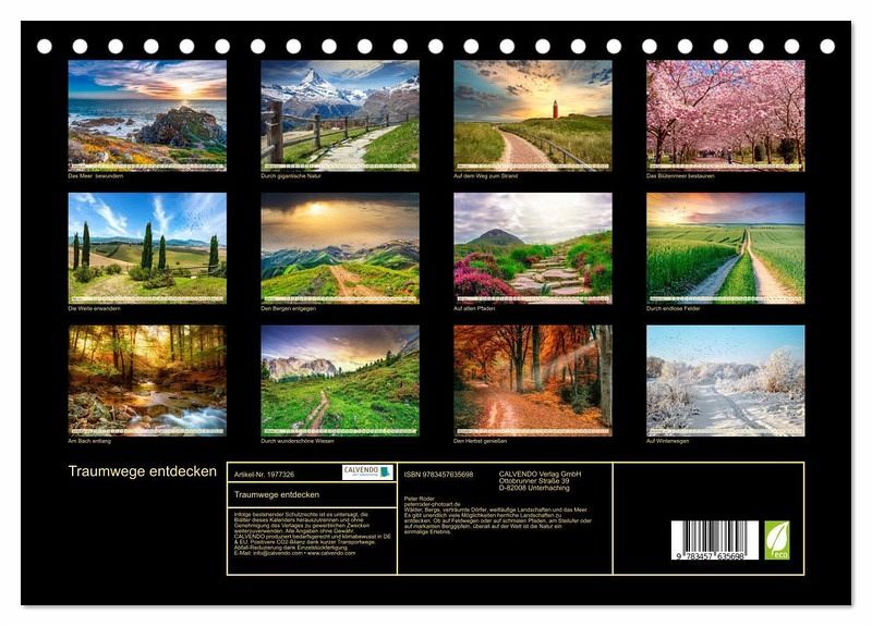 QUALITÄT - Hochwertiger Fotokalender mit 12 wunderschönen Motiven auf lichtbeständigem Bilderdruckpapier, robuste Spiralbindung.NACHHALTIG - deutliche Abfallreduzierung durch bedarfsgerechte Einzelstückfertigung, umweltfreundliches FSC-zertifiziertes Papier, Produktion in Deutschland, klimabewusste Logistik.PERFEKTES GESCHENK - Kalender für Freunde und Familie, für Kinder und Erwachsene, jung und alt, zu Weihnachten, Geburtstag oder zwischendurch.VIELFALT - Bildkalender in verschiedenen Formaten, z.B. DIN A5, DIN A4, DIN A3 sowie DIN A2. Ob Naturmotiv, Gemälde oder Fotos, ideal für ein persönliches Wohlfühlambiente.Traumwege entdecken - Erholung für Seele, Körper und Geist. von Autor(in): Peter Roder