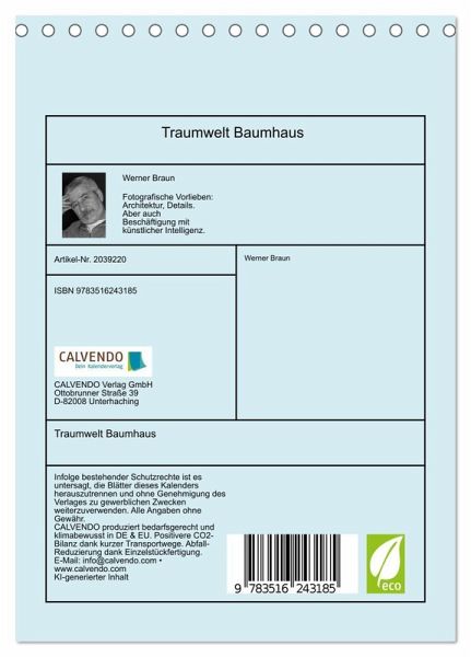Der Kalender "Traumwelt Baumhäuser" nimmt uns mit auf eine Reise zu einer nie zuvor gesehenen Baumhaus-Architektur, erschaffen von einem Algorithmus. Wir besuchen 12 kleinere und größere Siedlungen, jede auf ihre eigene Art reizvoll. Der Kalender zeigt die kreativen Möglichkeiten von künstlicher Intelligenz und lädt Sie ein, die Welt mit neuen Augen zu sehen. Ein Highlight für alle Freunde von Design, Architektur und Technologie und ein Hingucker für jede Wohnzimmerwand.
