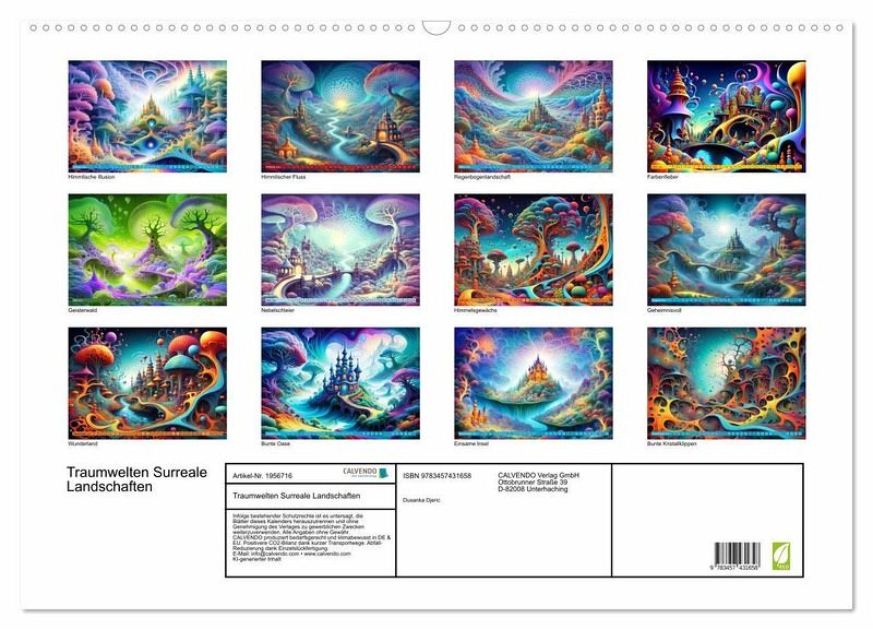 QUALITÄT - Hochwertiger Fotokalender mit 12 wunderschönen Motiven auf lichtbeständigem Bilderdruckpapier, robuste Spiralbindung mit Aufhängebügel.NACHHALTIG - deutliche Abfallreduzierung durch bedarfsgerechte Einzelstückfertigung, umweltfreundliches FSC-zertifiziertes Papier, Produktion in Deutschland, klimabewusste Logistik.PERFEKTES GESCHENK - Kalender für Freunde und Familie, für Kinder und Erwachsene, jung und alt, zu Weihnachten, Geburtstag oder zwischendurch.VIELFALT - Bildkalender in verschiedenen Formaten, z.B. DIN A5, DIN A4, DIN A3 sowie DIN A2. Ob Naturmotiv, Gemälde oder Fotos, ideal für ein persönliches Wohlfühlambiente.Landschaften jenseits der Realität. von Autor(in): Dusanka Djeric