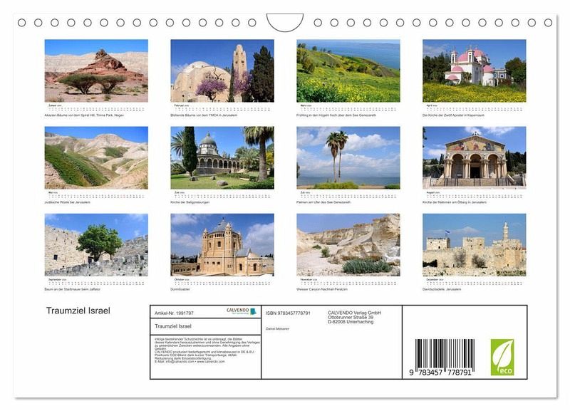 QUALITÄT - Hochwertiger Fotokalender mit 12 wunderschönen Motiven auf lichtbeständigem Bilderdruckpapier, robuste Spiralbindung mit Aufhängebügel.NACHHALTIG - deutliche Abfallreduzierung durch bedarfsgerechte Einzelstückfertigung, umweltfreundliches FSC-zertifiziertes Papier, Produktion in Deutschland, klimabewusste Logistik.PERFEKTES GESCHENK - Kalender für Freunde und Familie, für Kinder und Erwachsene, jung und alt, zu Weihnachten, Geburtstag oder zwischendurch.VIELFALT - Bildkalender in verschiedenen Formaten, z.B. DIN A5, DIN A4, DIN A3 sowie DIN A2. Ob Naturmotiv, Gemälde oder Fotos, ideal für ein persönliches Wohlfühlambiente.Eine farbenfrohe Bilder-Reise durch das Heilige Land von Autor(in): Daniel Meissner