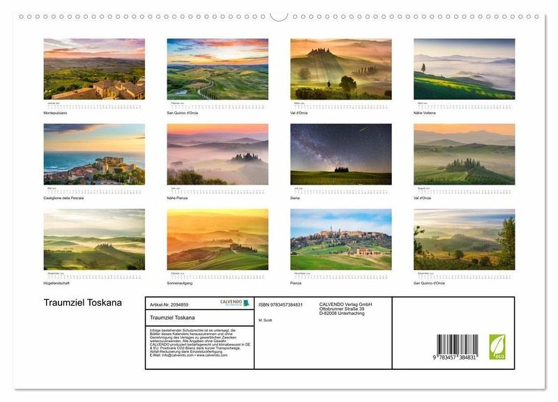 Erleben Sie das ganze Jahr über die Schönheit der Toskana mit unserem neuen Kalender! Lassen Sie sich jeden Monat von eindrucksvollen Landschaften und mittelalterlichen Dörfern verzaubern. Unsere hochwertigen Fotografien zeigen die Toskana von ihrer besten Seite und bringen das italienische Lebensgefühl direkt zu Ihnen nach Hause. Ob auf Ihrem Schreibtisch oder in Ihrem Wohnzimmer, unser Toskana Kalender ist das perfekte Accessoire für alle, die das mediterrane Leben lieben. Holen Sie sich jetzt ein Stück Toskana in Ihr Zuhause und genießen Sie das ganze Jahr über die Schönheit dieser wunderbaren Region!