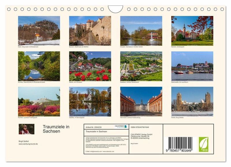 Die Fotografin Birgit Seifert lädt Sie zu 12 Ausflügen nach Sachsen ein. Sie wählte in diesem Kalender Geheimtipps aus, die in kleineren Orten und Gemeinden liegen. Zum Auffinden der Sehenswürdigkeiten und des Kamerastandortes befinden sich die genauen GPS Koordinaten unter jedem Bildtitel.