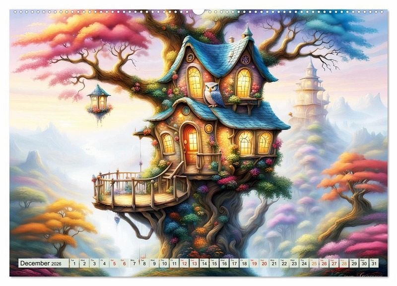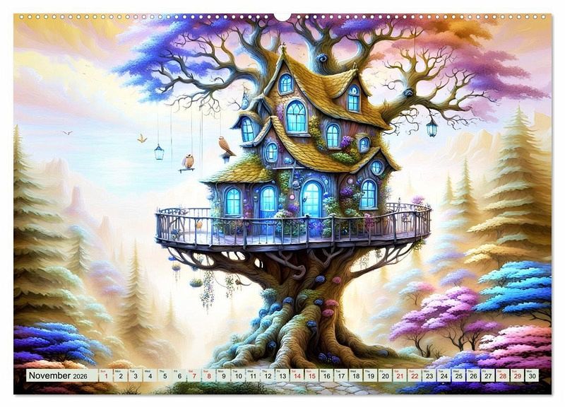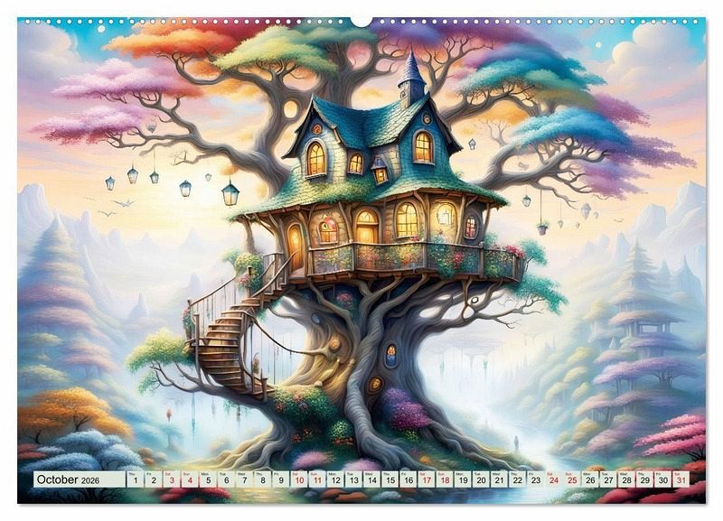 Discover magical, unusual tree houses hidden among the canopies of leaves and experience an imaginative and colourful year created with artificial intelligence. Every month you will see a tree house where nature is in perfect harmony. Enjoy a tree house every day, drawn with many enchanting details.